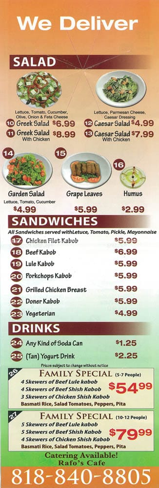 Welcome to Rafos Cafè, a delightful hub for pizza lovers and Mediterranean cuisine enthusiasts alike, located at 101 N Victory Blvd suite #K, Burbank, CA. With a diverse menu that features appetizers, New York-style pizzas, and handcrafted sandwiches, every dish is crafted with quality ingredients and bursting with flavor.